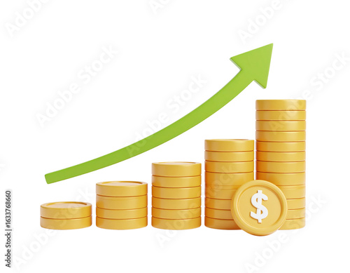 Gold coins stacked on financial growth graph represent successful business investment concept, isolated on white background