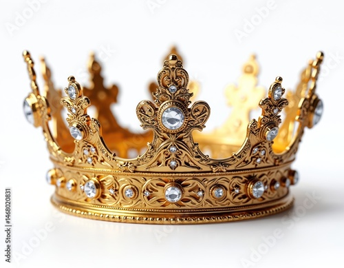 Gold crown with precious stones isolated on plain white background. Symbol of wealth, royalty, kingdom. Perfect for design related to luxury, success, monarchy, leadership, power, empire, royal