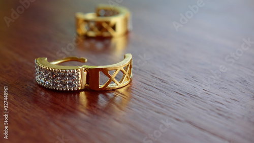 Gold earrings set with diamonds laid on the ground