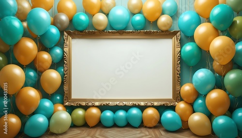Gold Frame Surrounded by Teal and Gold Balloons