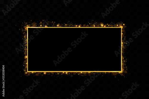 Gold frame with fiery sparks. Gold frame with light effects. Shining banner.