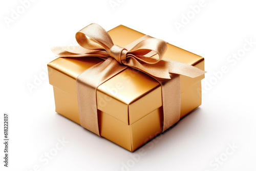 Gold Gift Box With Gold Ribbon On White Background. Generative AI