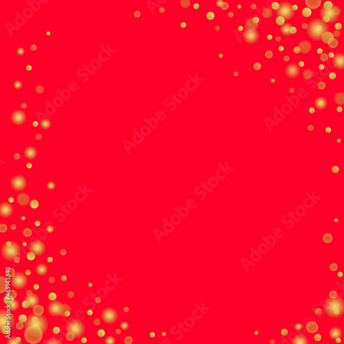 Gold holiday confetti glitter on red background. Alluring festive overlay template. Majestic merry sparkling frame. Rich polka dots jpeg illustration