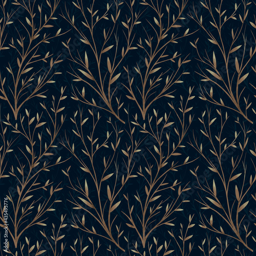 gold leaves on dark blue background seamless pattern, hand drawn clipart, colorful wallpaper