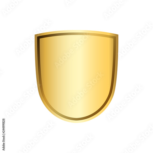 Gold shield shape icon. 3D golden emblem sign isolated on white background. Symbol of security, power, protection. Badge shape shield graphic design. Vector illustration