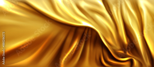 Gold silk texture. Luxury satin fabric curtain background. Abstract golden liquid velvet cloth material with elegant drapery. Royalty shine 3d cover realistic banner surface with smooth drape.