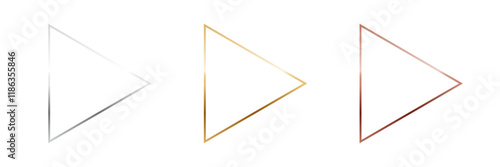 Gold, silver and bronze triangle frames. Metal thin play buttons isolated on transparent background. 3d realistic empty template vector illustration set.