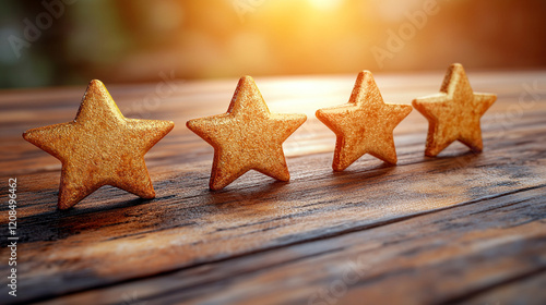 Gold star rating review symbolizing best quality customer satisfaction success premium rank shiny golden icon on modern bright background with empty caption space and blurred effect