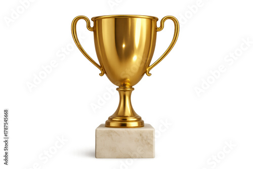 Gold trophy cup with two handles and a marble base, symbolizing success, winning, and excellence, isolated on a transparent background