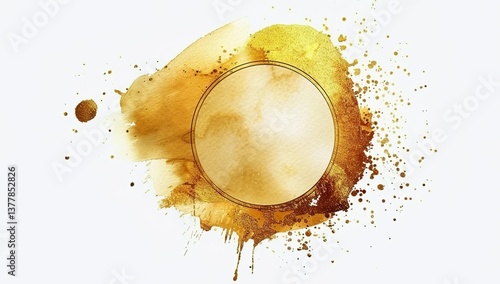 Gold watercolor splashes in a circular frame on a white background, with golden color and elements.
