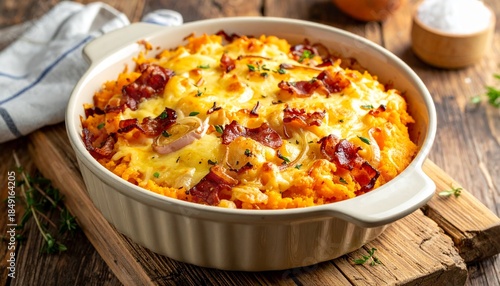 Goldbraun gebackene Süßkartoffel-Casserole mit knusprigem Bacon, geschmolzenem Käse