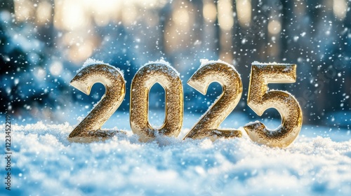 Golden 2025 in sparkling snowy winter wonderland, celebrating new year and holiday season