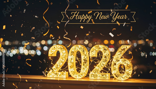 Golden 2026 illuminated numbers and confetti, celebrating the arrival of the New Year with a festive bokeh background