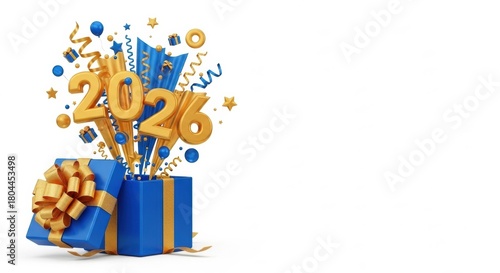 Golden 2026 numbers exploding from a blue and gold gift box with party elements