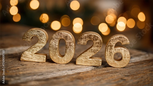 Golden 2026 numbers on rustic wooden surface with warm bokeh lights and festive glow for new year celebration and holiday decoration