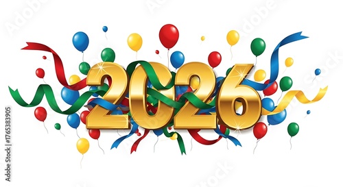 Golden 2026 numbers with colorful balloons and swirling ribbons creating a festive and celebratory new year s eve party atmosphere