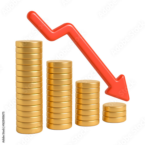 Golden 3D Coins with Red Downward Chart Arrow – Bitcoin Price Decline PNG