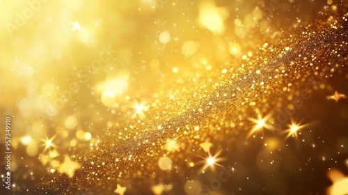 Golden abstract background with a bokeh circle and shiny stars. New year, birthday, holidays celebration.