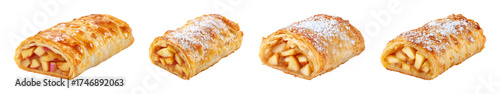 Golden apple strudel pastry with delicate dusting of powdered sugar, appetizing bakery delight PNG set with transparent background