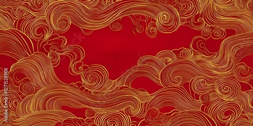 Golden asian chinese new year celebration frame background, abstract red Japanese cloud wave art pattern design backdrop, traditional lunar festival empty rectangle border wallpaper