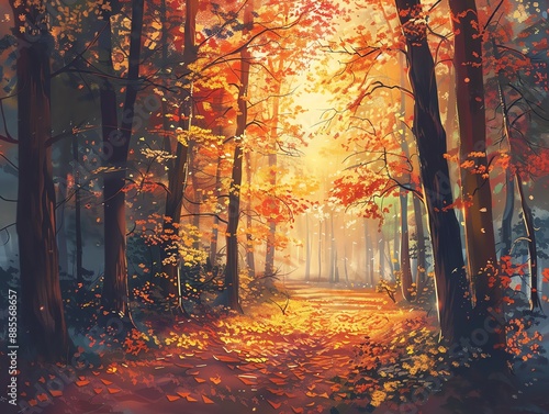 Golden Autumn Forest. Pathway Illuminated by Sunlight Through Colorful Trees