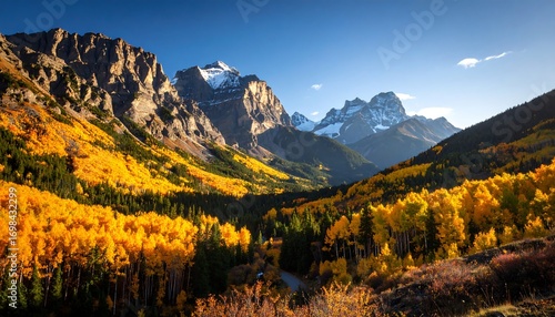 Golden autumn hues illuminate a mountain landscape under a clear sky