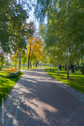 golden autumn in a park with trees dropping the leaves in the still green grass