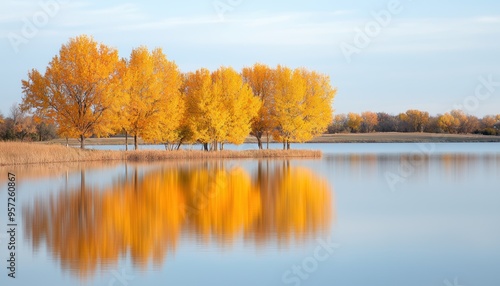 Golden Autumn Trees Reflecting in a Tranquil Lake Under a Clear Blue Sky