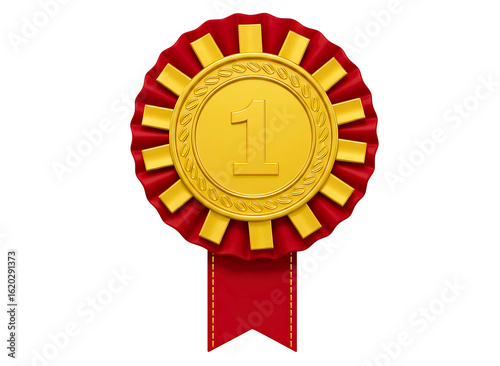 Golden award rosette with red and gold ribbons isolated on transparent background first place