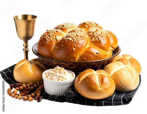 Golden baked bread and rolls arranged with a ceremonial goblet and grains for a festive meal