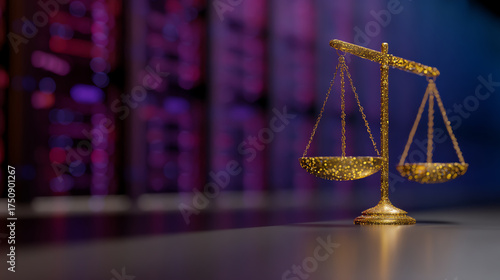Golden balance scale with glitter texture standing on a reflective surface against a blurred purple and blue background