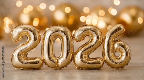Golden balloons shaped as the numbers 2026, set against a blurred background of golden ornaments and soft lights, symbolizing New Year celebrations.