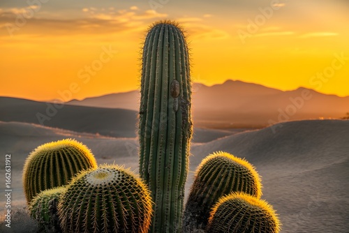 Golden Barrel Cacti Against Orange Desert Mountain Sunset