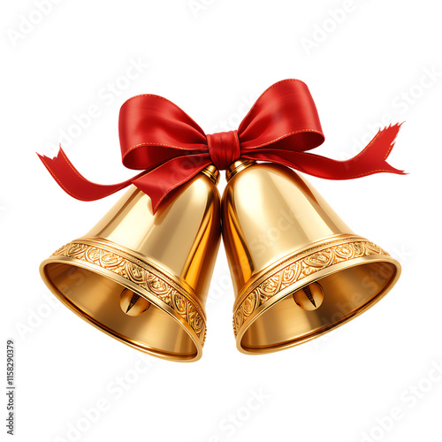 Golden bells with red ribbon isolated on transparent background, Ai generative images