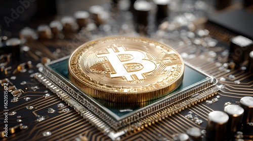 Golden bitcoin coin on a computer circuit board.