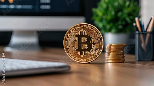 Golden Bitcoin coin standing on a desk against a computer screen, symbolizing cryptocurrency trading and digital finance.