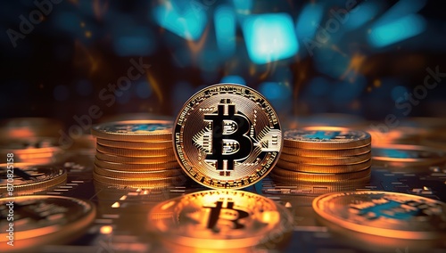 Golden bitcoin on a digital background. Cryptocurrency concept. 3D Rendering