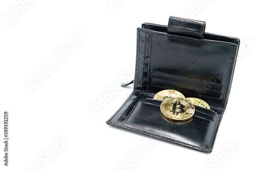 Golden bitcoins in open leather wallet - Future Currency - fincance concept - free white space