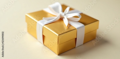 Golden box with nougat wrapped in white ribbon on a clean surface, Golden, Treat