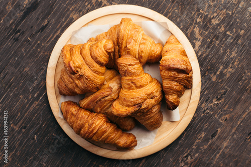 Golden Brown Croissants on Rustic Wooden Board