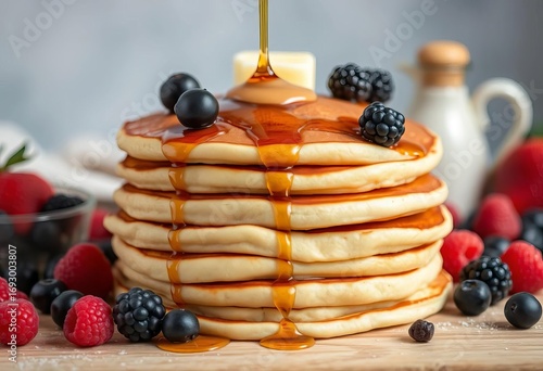 Golden brown fluffy pancakes stacked high, syrup drizzled, berries scattered, morning, brown