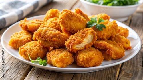 Golden brown fried chicken nuggets, crispy on the outside and juicy on the inside, served on a pristine white plate.