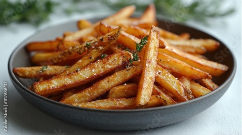 Golden brown fries rest elegantly in a rustic bowl, garnished with herbs, ready to satisfy