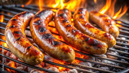 Golden Brown Sausages Sizzle Over Embers, A Culinary Delight That Entices With The Aroma Of Smoke And Spice.