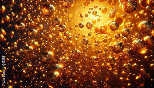 Golden bubbles suspended in liquid creating a mesmerizing abstract background shining brilliantly