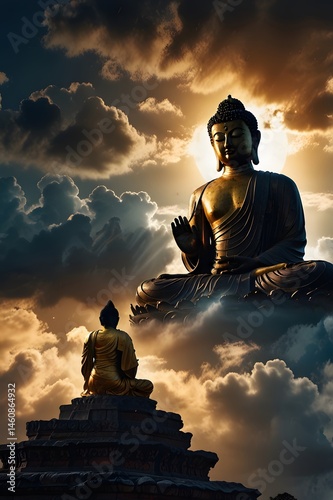 Golden buddha statue meditation buddhism art cloudscape spiritual enlightenment peace and harmony serene scene