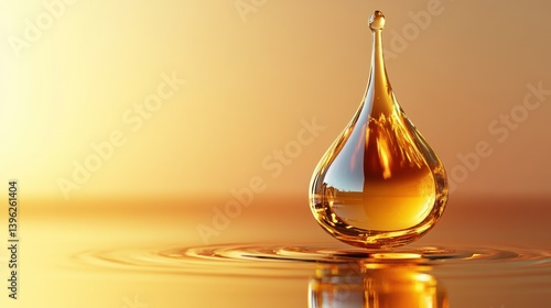 Golden cascade: A lustrous drop creating ripples on a fluid surface, reflecting light