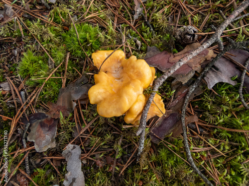 Golden chanterelle mushrooms growing in the forest, covered with dirt and moss among forest vegetation. Nature scenery