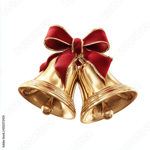 Golden Christmas Bells with a Red Ribbon , PNG isolated cut out image