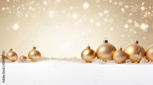 Golden Christmas Ornaments on Snowy Border with Glittering Gold Background for Festive Decoration